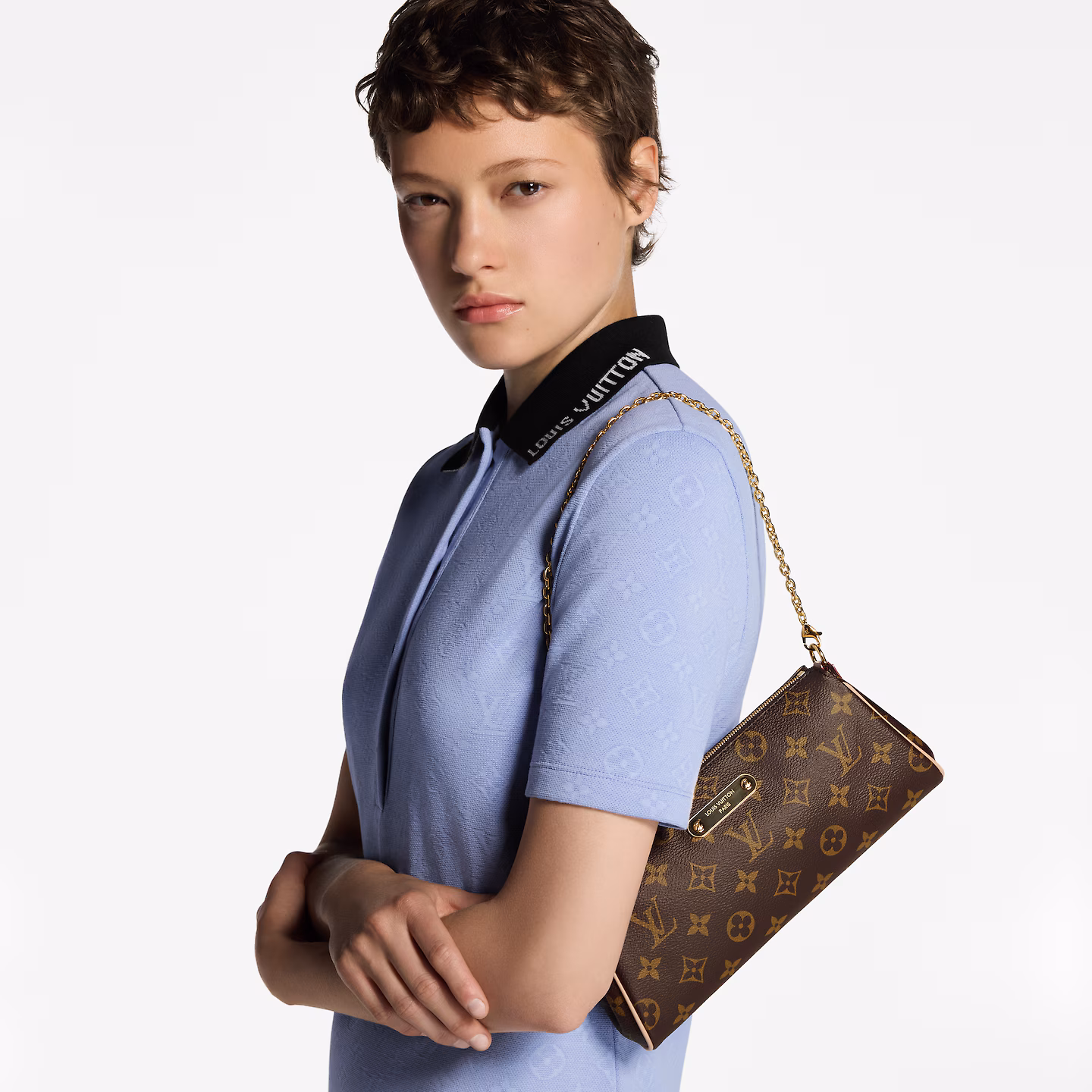 This elegant Pochette Eva is offered in the House’s signature Monogram canvas with contrasting leather trims for a refined finish. The versatile design is elevated with gold-toned hardware, including an engraved Louis Vuitton plaque that matches the removable chain. It is sized to store everyday items, including a compact wallet and makeup essentials.