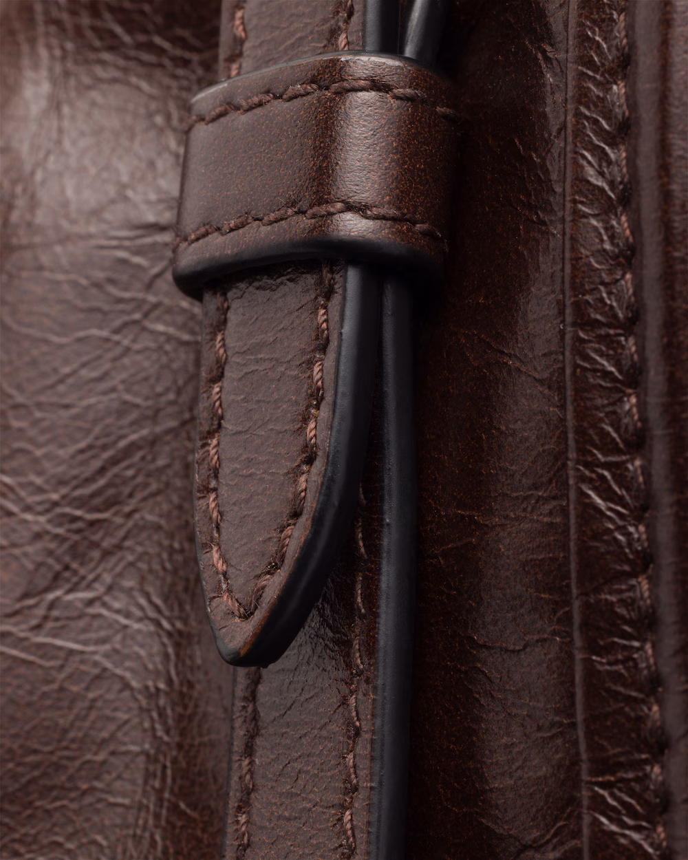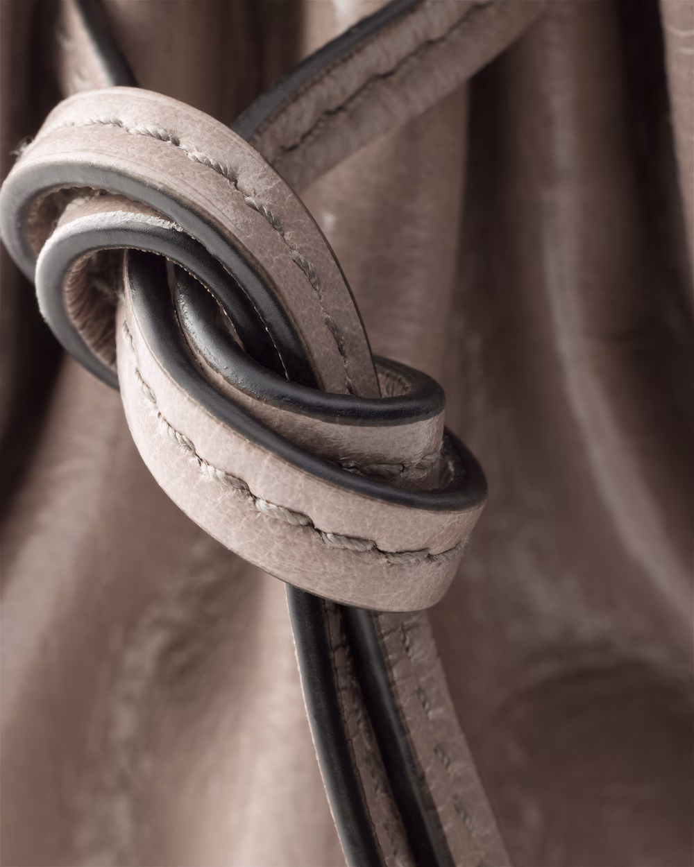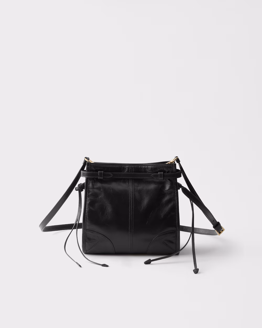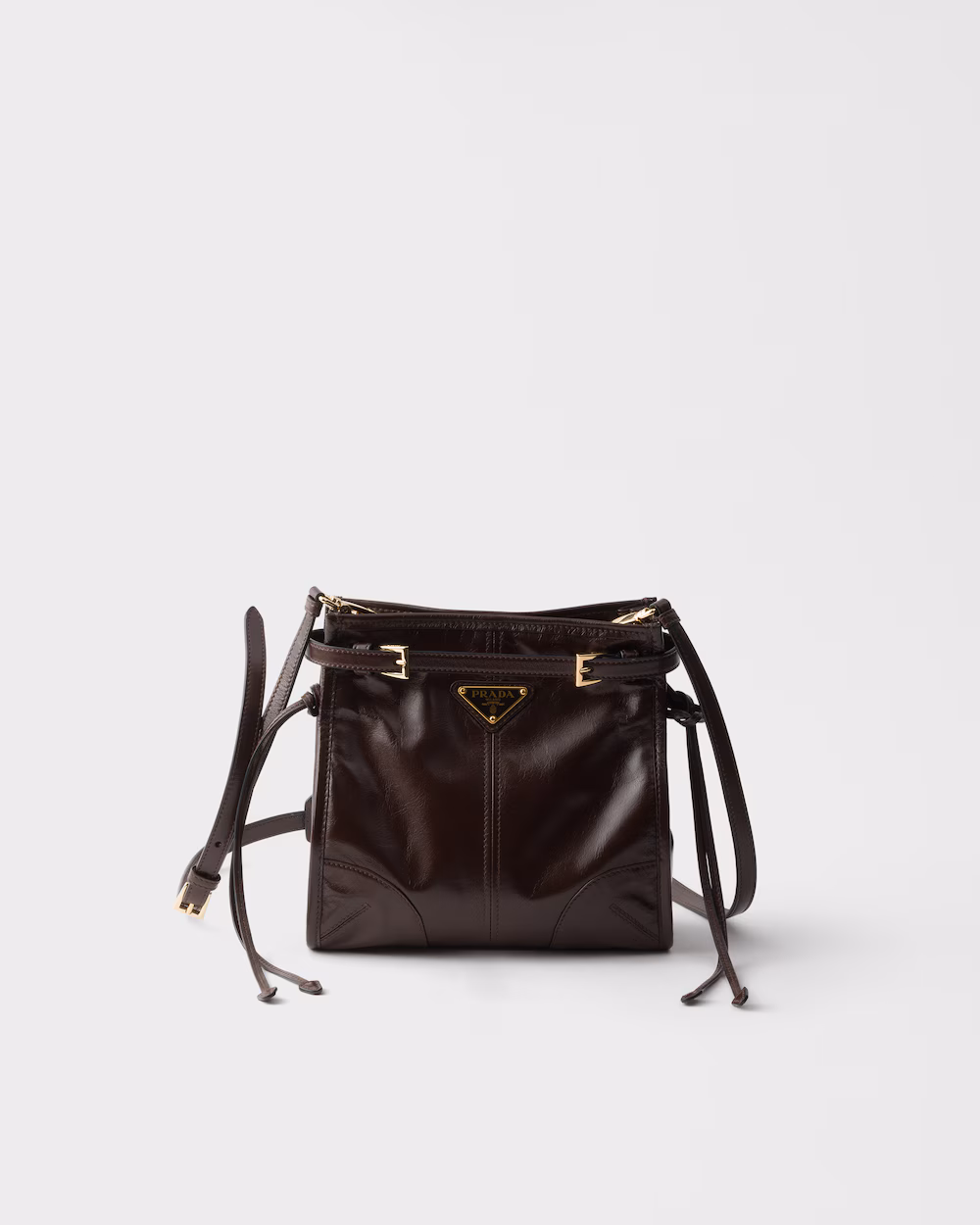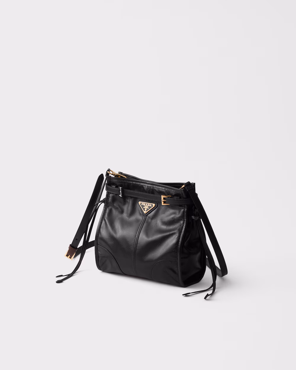 A pragmatic but refined design defines this handbag made of soft leather with a shiny finish that emphasizes its modern, versatile allure. The clean-lined silhouette blends different influences into one style with a sleek, distinctive aesthetic. Embellished by the sophisticated detail of narrow straps, the roomy bag has an interior equipped with zipper pockets. The enameled metal triangle logo completes the look with its iconic signature.