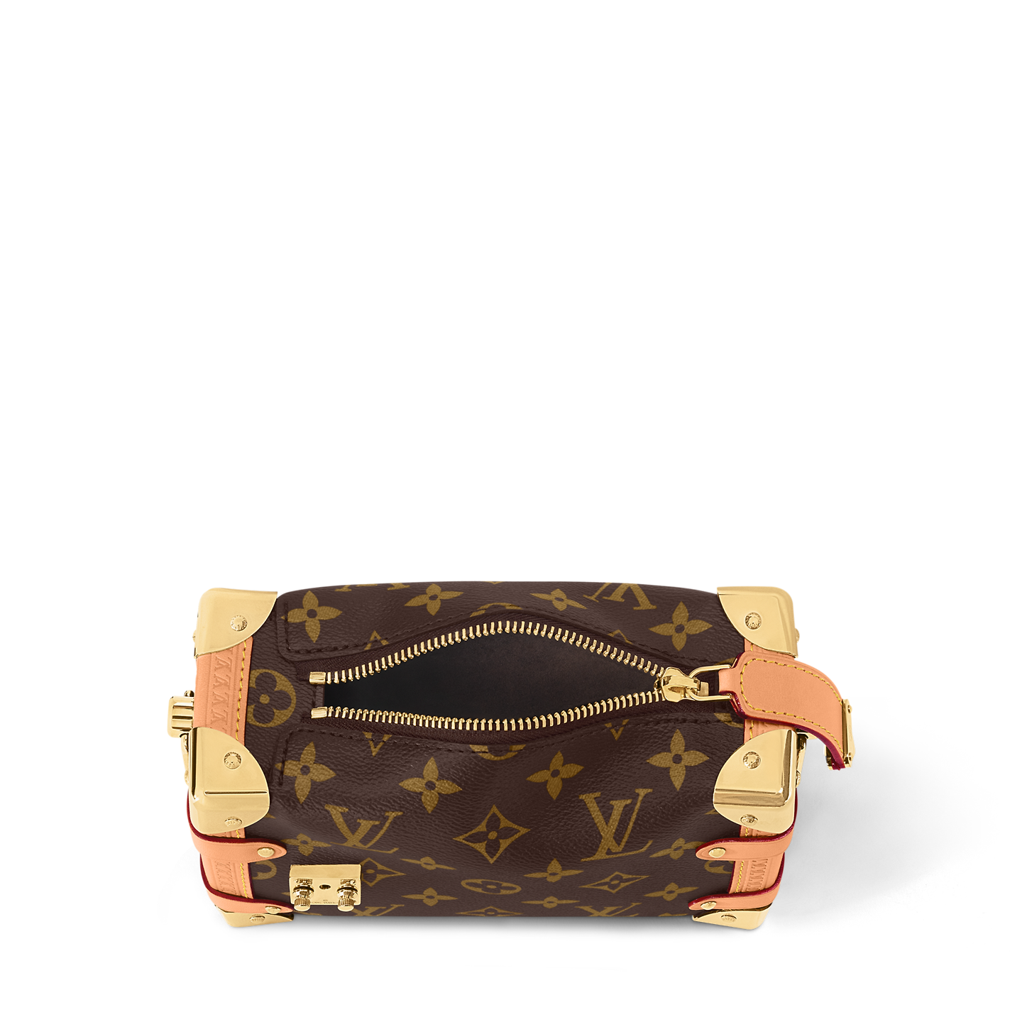 Evocative of the House’s historic trunks, the Side Trunk PM’s rectangular shape is fashioned from Monogram canvas with cowhide-leather trim and gold-color hardware. The reinforced corners and S-lock attached to the zipper are directly inspired by Louis Vuitton trunks. It can be carried by hand or on the shoulder thanks to the removable and adjustable leather strap.